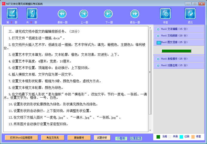 说明:NIT文字处理(A043)采用无纸化考试,上机操作。考试时间为100分钟。软件环境:操作系统为Windows 7;办公软件为Microsoft Office Word 2016。主要考查项目包括:文本编辑(15分)、文档排版(20分)、图文混排(25分)、表格操作(25分)、对象应用(15分)。