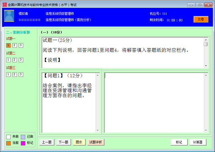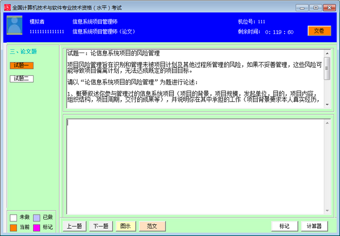 本系统依据全国计算机技术与软件专业技术资格考试《信息系统项目管理师》考试大纲研制而成。系统具有全真模拟、精选真题、详尽解析、自动评分等功能,系统中包含历次考试真题。系统分训练模式和考试模式两种练习方式,可更好地满足考生学习要求。欢迎全国软考考生下载使用。