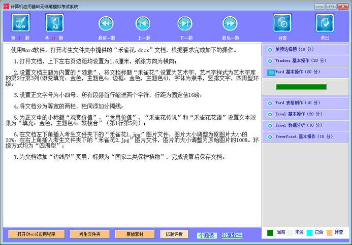 说明:NIT计算机应用基础采用无纸化考试,上机操作。考试时间为100分钟。软件环境:操作系统为Windows 7;办公软件为Microsoft Office 2016。主要考查项目包括:选择题(计算机基础知识和计算机网络的基本知识)(10分)、Windows基本操作(20分)、Word基本操作(20分)、Word表格制作 (10分)、Excel基本操作(20分)、Excel数据分析(10分)、PowerPoint基本操作(10分)。