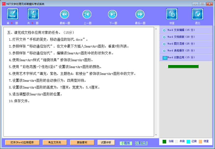 说明:NIT文字处理(A043)采用无纸化考试,上机操作。考试时间为100分钟。软件环境:操作系统为Windows 7;办公软件为Microsoft Office Word 2016。主要考查项目包括:文本编辑(15分)、文档排版(20分)、图文混排(25分)、表格操作(25分)、对象应用(15分)。