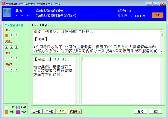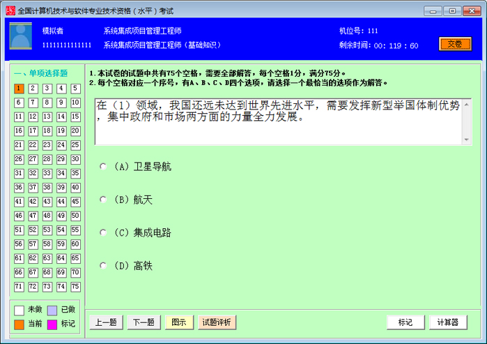 本系统依据全国计算机技术与软件专业技术资格考试《系统集成项目管理工程师》考试大纲研制而成。系统具有全真模拟、精选真题、详尽解析、自动评分等功能,系统中包含历次考试真题。系统分训练模式和考试模式两种练习方式,可更好地满足考生学习要求。欢迎全国软考考生下载使用。